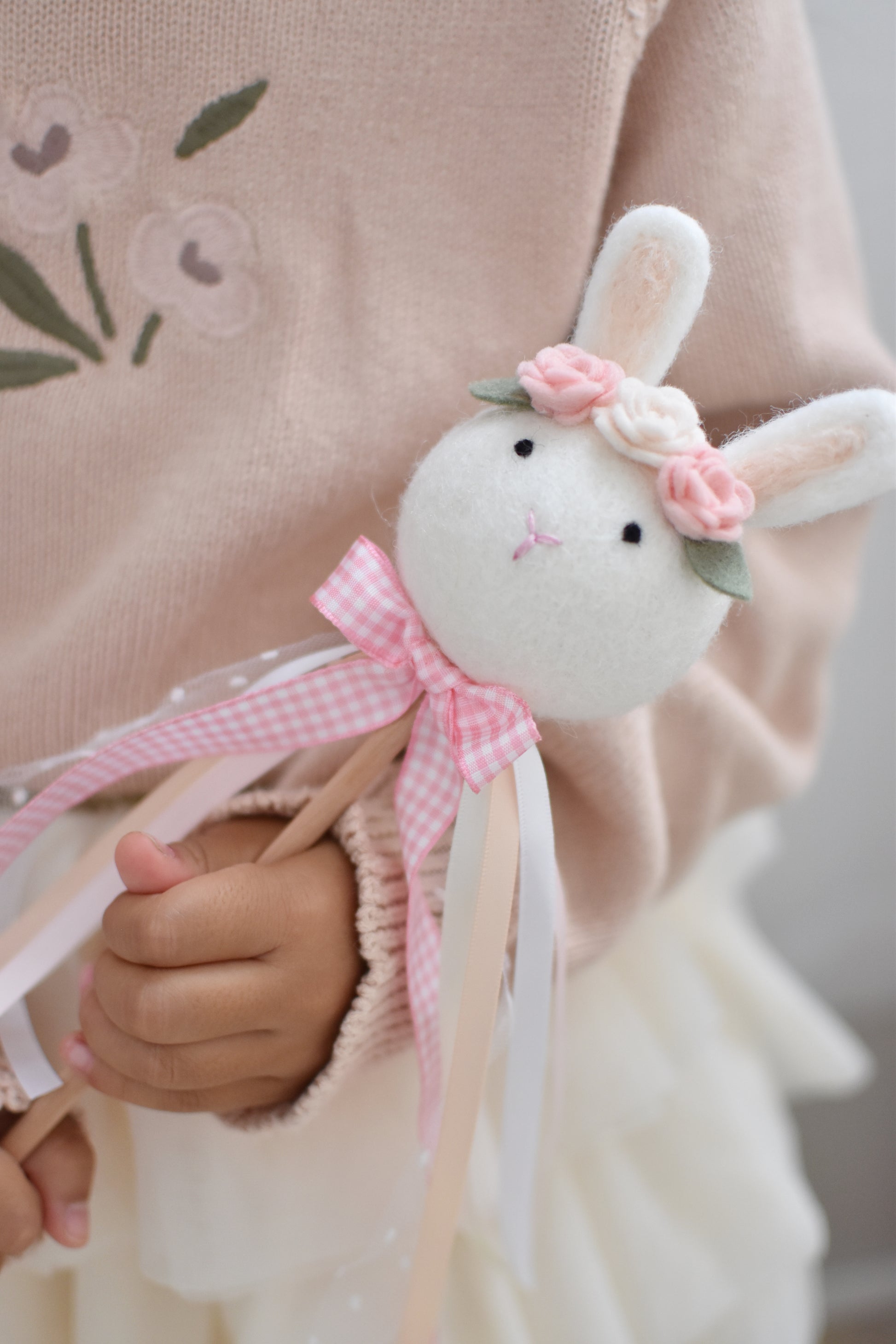 Add a sprinkle of Easter magic with this Bunny Wand! Featuring a 100% wool felt bunny adorned with a delicate pink flower crown and a gingham bow, it’s finished with a tassel of ribbons on a wooden wand. Perfect for Easter fun, it’s sure to bring joy and charm to any celebration!