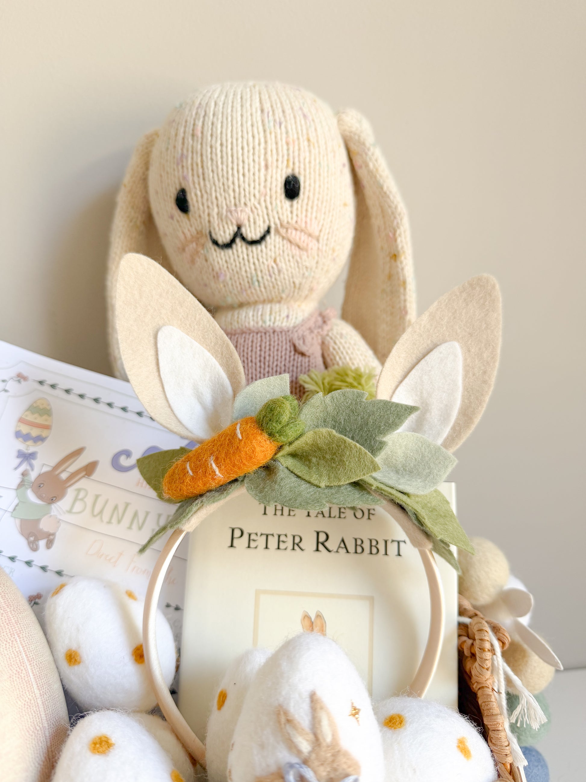 This adorable bunny ears headband features handcrafted carrot nestled in greenery leaves, ideal for Easter celebrations or imaginative playtime. Suitable for ages 3+.