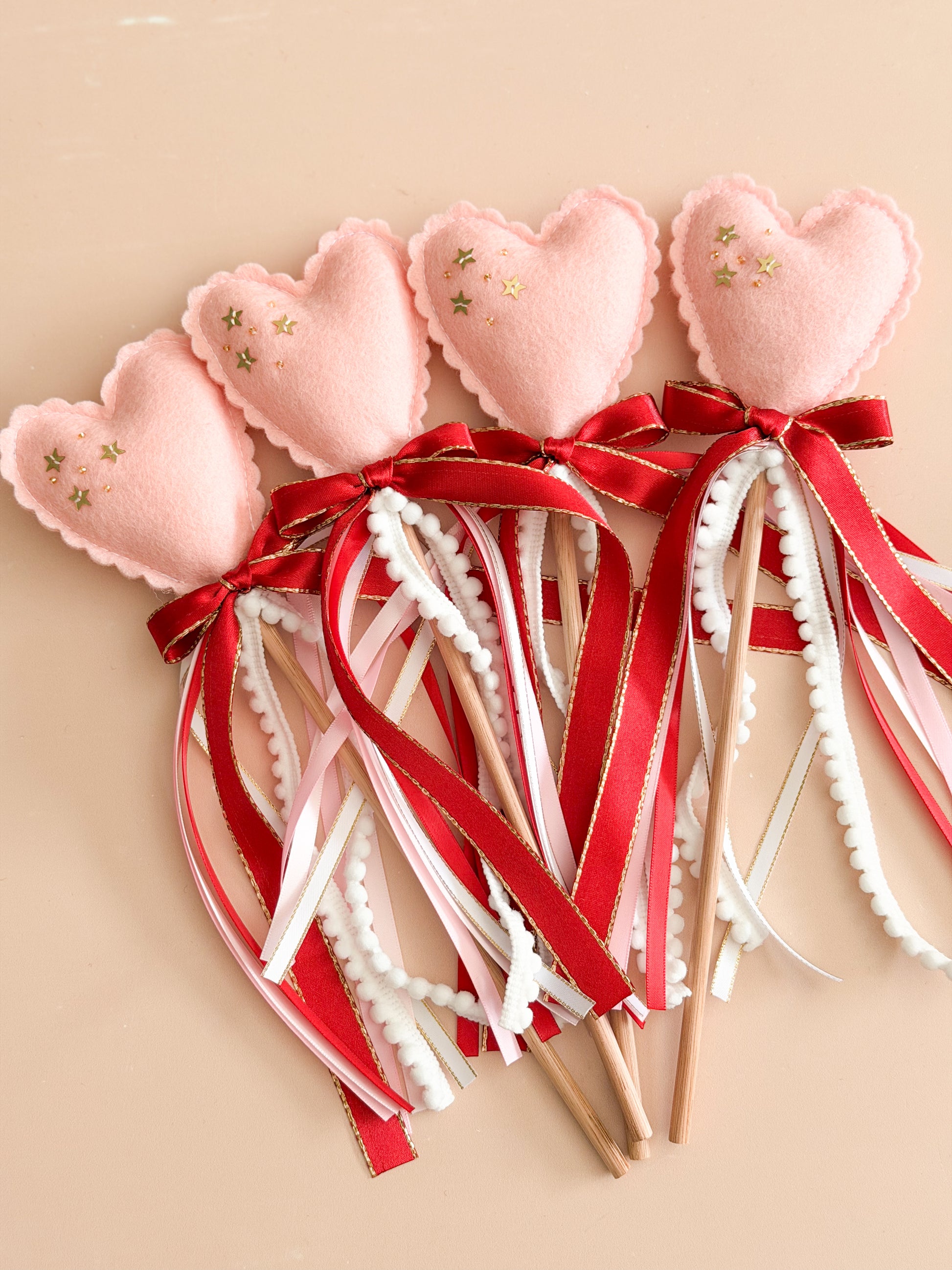 Add a whole lot of love and whimsy to Valentine’s Day and beyond with this handmade wool felt Heart Wand. Beautifully crafted with a soft pink heart featuring a delicate scalloped edge, it’s adorned with hand-embroidered star sequins and set atop a wooden stick, finished with a flowing ribbon tassel. Perfect for little hands to twirl, wave, and delight in imaginative play. Whether part of a celebration, a birthday surprise, or everyday make-believe, this sweet keepsake is as beautiful as it is fun. Listing is for 1 Heart Wand.